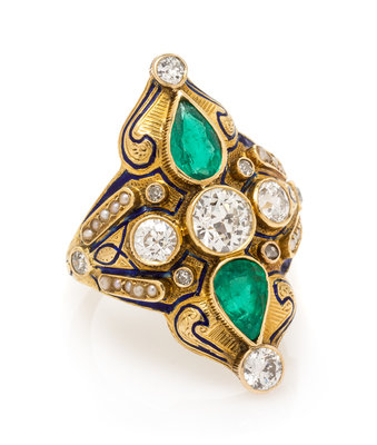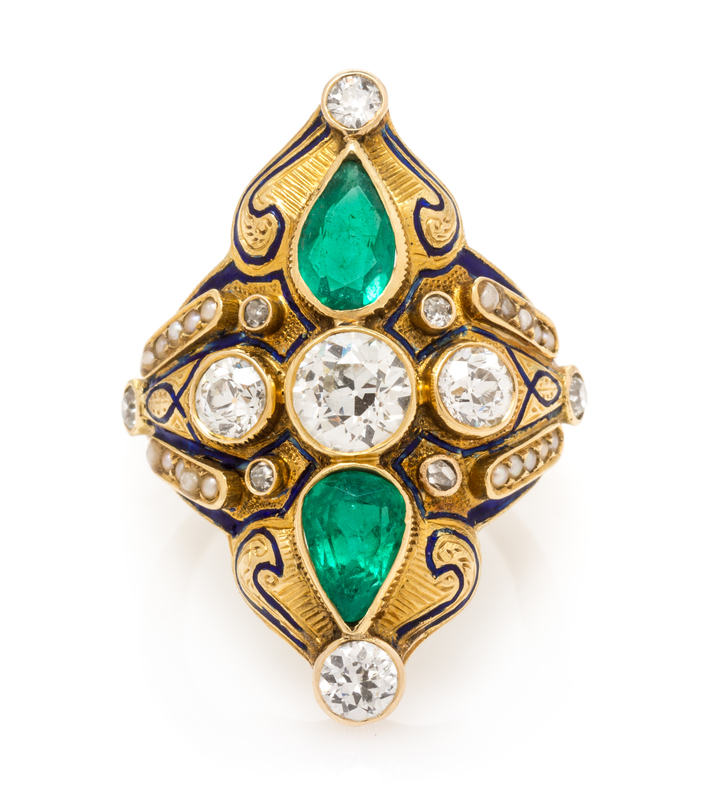 containing one old European cut diamond weighing approximately 0.98 carat, two old European cut diamonds weighing approximately 0.75 carat total, eight old European, round single and rose cut diamonds weighing approximately 0.60 carat total, two pear shape mixed cut emeralds weighing approximately 1.70 carats total, 20 seed pearls and opaque blue enamel accents.