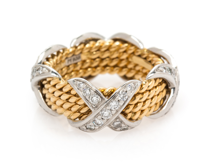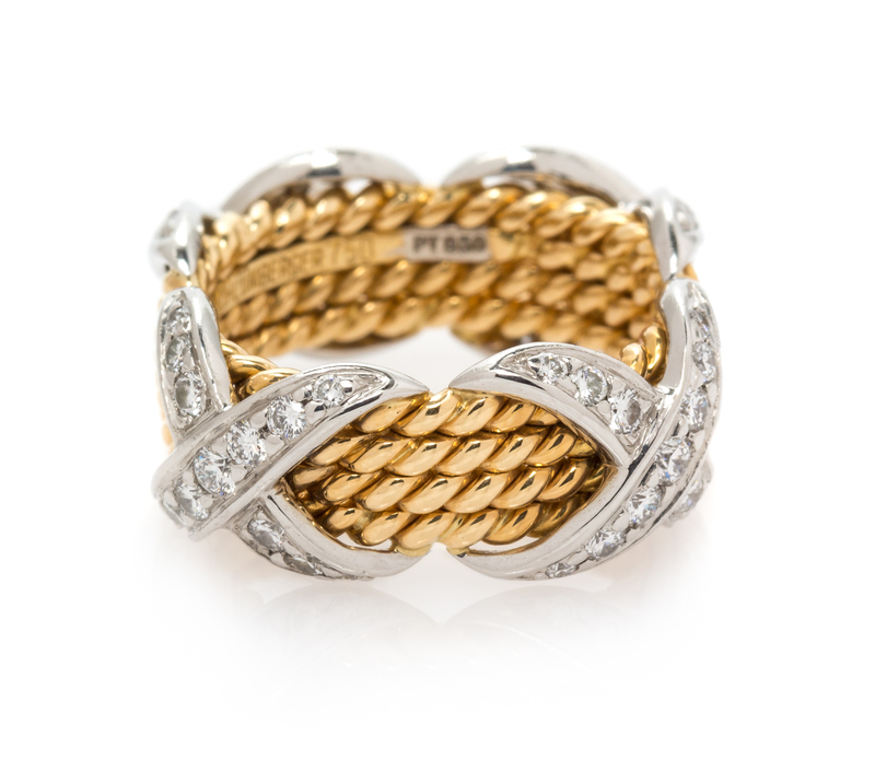 consisting of four yellow gold twisted rope texture rows with three applied platinum crisscross accents containing 52 round brilliant cut diamonds weighing approximately 0.70 carat total.Stamp: TIFFANY&CO. SCHLUMBERGER 750 PT950.Accompanied by an inner and outer box signed Tiffany & Co.