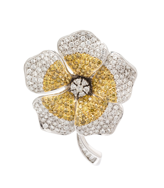 consisting of a five-petaled design, containing 110 round brilliant cut colored diamonds (origin of color not tested) weighing approximately 2.20 carats total, 135 round brilliant cut diamonds weighing approximately 3.00 carats total and 14 tapered baguette cut diamonds weighing approximately 0.30 carat total.Stamp: 18K 750 KCJ.