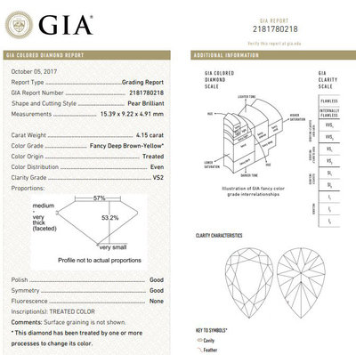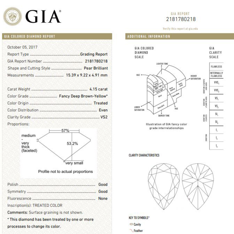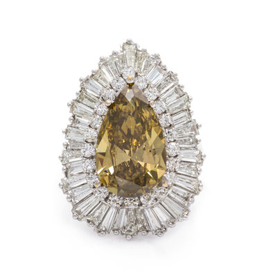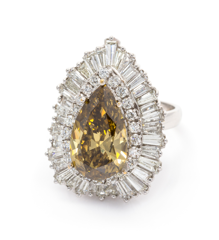 containing one pear shape brilliant cut diamond weighing 4.15 carats, 22 round brilliant cut diamonds weighing approximately 0.33 carat total and numerous tapered baguette cut diamonds, the central portion of the ring detaches and can be worn as a pendant.Stamp: 16852 RING-DANT 10%IRIDPLAT.Accompanied by a Gemological Institute of America colored diamond grading certificate number 2181780218, dated October 5, 2017, 2017, stating Color: Treated, Fancy Deep Brown-Yellow, Even, Clarity: VS2, Polish: Good, Symmetry: Good, Fluorescence: None, Inscription: TREATED COLOR.