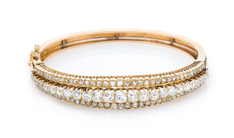 containing 25 old mine cut diamonds weighing approximately 1.78 carats total and numerous rose cut diamonds weighing approximately 1.25 carats total, hinged with a side clasp.