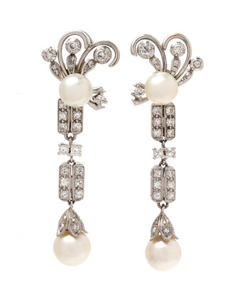 consisting of white gold earring tops with removable platinum drops, containing 54 old European, single and round brilliant cut diamonds weighing approximately 1.45 carats total and four pearls measuring approximately 8.04-9.13 mm in diameter.