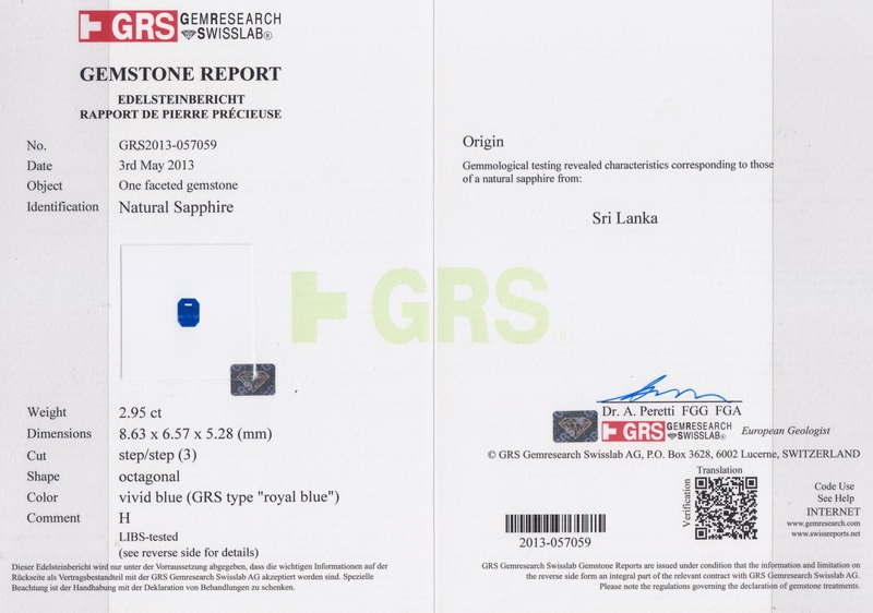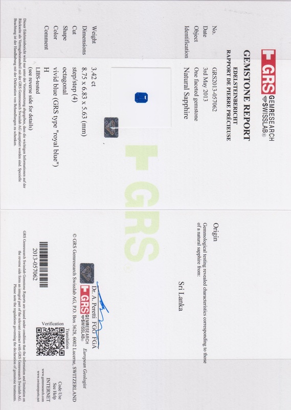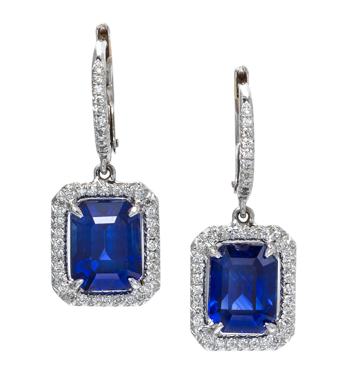 containing two octagonal step cut sapphires weighing approximately 6.37 carats total and 84 round brilliant cut diamonds weighing approximately 0.58 carat total.Stamp: 18KWG.
