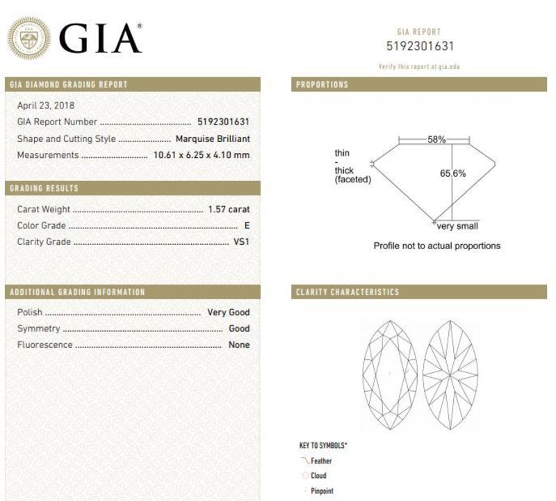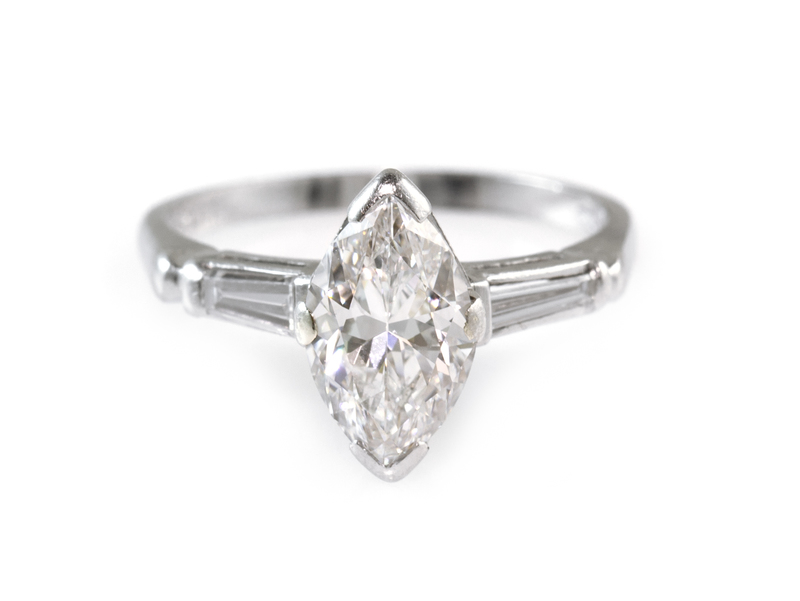 containing one marquise cut diamond weighing 1.57 carats and two tapered baguette cut diamonds weighing approximately 0.23 carat total.Stamp: 10%IRID.PLAT (MC maker's mark). Accompanied by a Gemological Institute of America diamond grading certificate number 5192301631, dated April 23, 2018, stating Color: E, Clarity: VS1, Polish: Very Good, Symmetry: Good, Fluorescence: None.