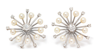 A Pair of White Gold, Diamond and Cultured Pearl Starburst Earrings,
