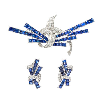 consisting of a brooch containing 31 square step cut sapphires, 55 round single cut diamonds weighing approximately 1.04 carats total and 16 baguette cut diamonds 0.24 carat total, together with a matching pair of earclips containing 28 square step cut sapphires and 24 round single cut diamonds weighing approximately 0.36 carat total.Stamp: 14K KS.