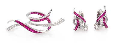 consisting of a brooch containing 33 square step cut rubies, 17 round brilliant and eight single cut diamonds weighing approximately 0.95 carat total, together with a matching pair of earclips containing 24 square step cut rubies and 30 round brilliant and single cut diamonds weighing approximately 0.90 carat total.Stamp: ASTOR PT.