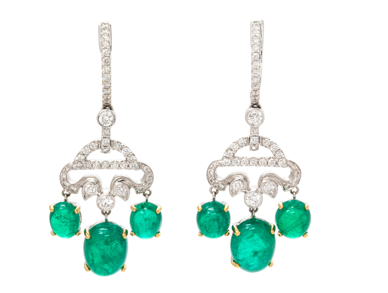 containing six oval cabochon cut emeralds weighing approximately 5.70 carats total and numerous round brilliant cut diamonds weighing approximately 1.10 carats total.Stamp: (maker's mark for Seaman Schepps) 750.Hand inscribed: 20764.