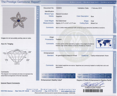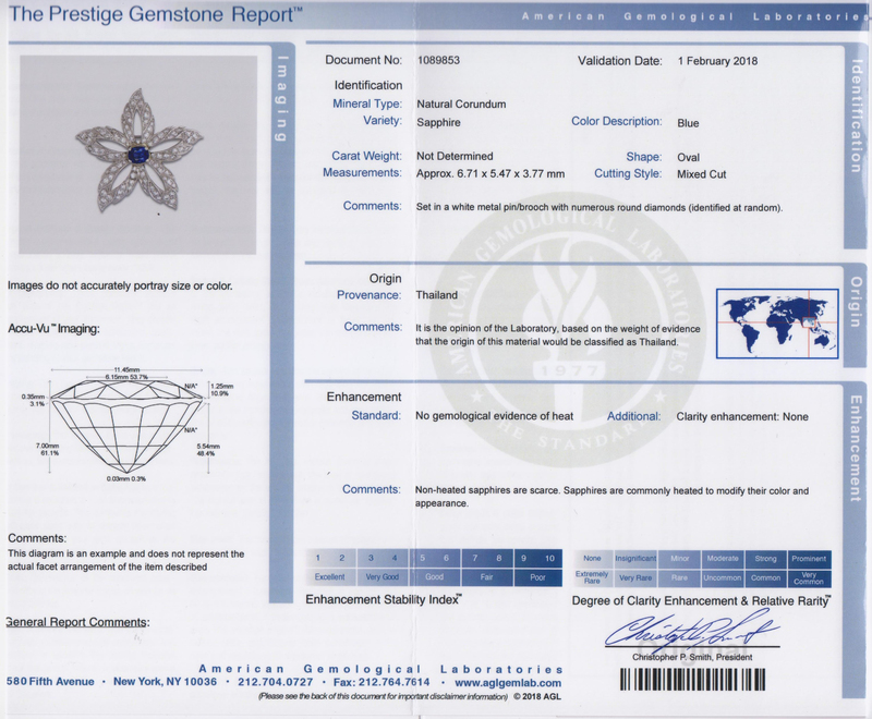 containing one oval mixed cut sapphire measuring approximately 6.71 x 5.47 x 3.77 mm and 85 round brilliant and single cut diamonds weighing approximately 2.78 carats total.Accompanied by the original bill of sale. Accompanied by an American Gemological Laboratories sapphire identification and origin certificate number 1089853, dated February 1, 2018, stating Mineral Type: Natural Corundum, Variety: Sapphire, Origin: Thailand, Enhancement: No evidence of heat.