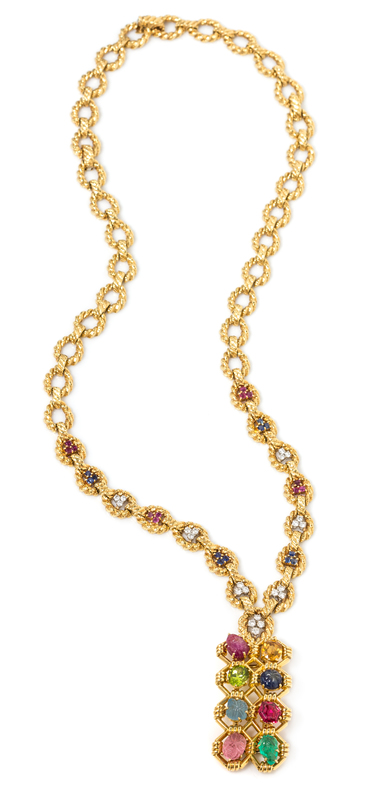An 18 Karat Yellow Gold, Platinum and Multigem Pendant/Brooch with Convertible Necklace/Bracelet, David Webb,