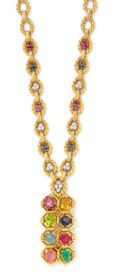 consisting of a removeable pendant/brooch containing a carved ruby, aquamarine, pink tourmaline, sapphire, emerald, one oval mixed cut peridot, citrine and one hexagonal step cut spinel, the convertible bracelet and necklace consisting of hammered textured rope shaped links measuring approximately 12.00 mm wide with the necklace section containing 22 round brilliant cut diamonds weighing approximately 1.23 carats total, 12 square step cut rubies and 12 square step cut sapphires.Pendant/brooch stamp: 18K WEBB.Necklace stamp: WEBB 18K PLAT (partially obscured).Bracelet stamp: 18K WEBB.