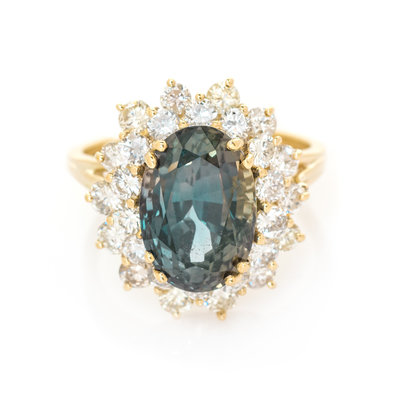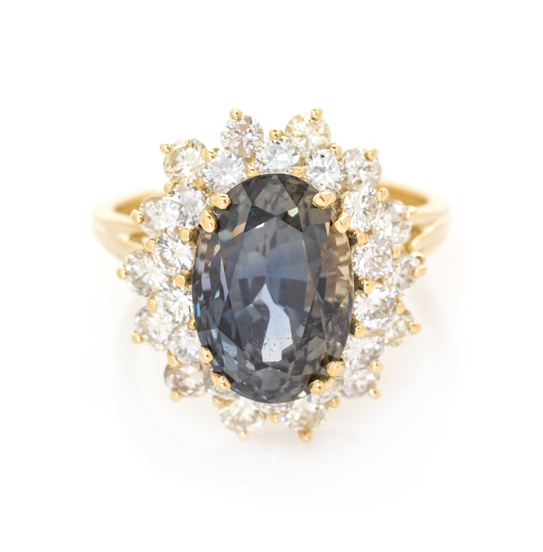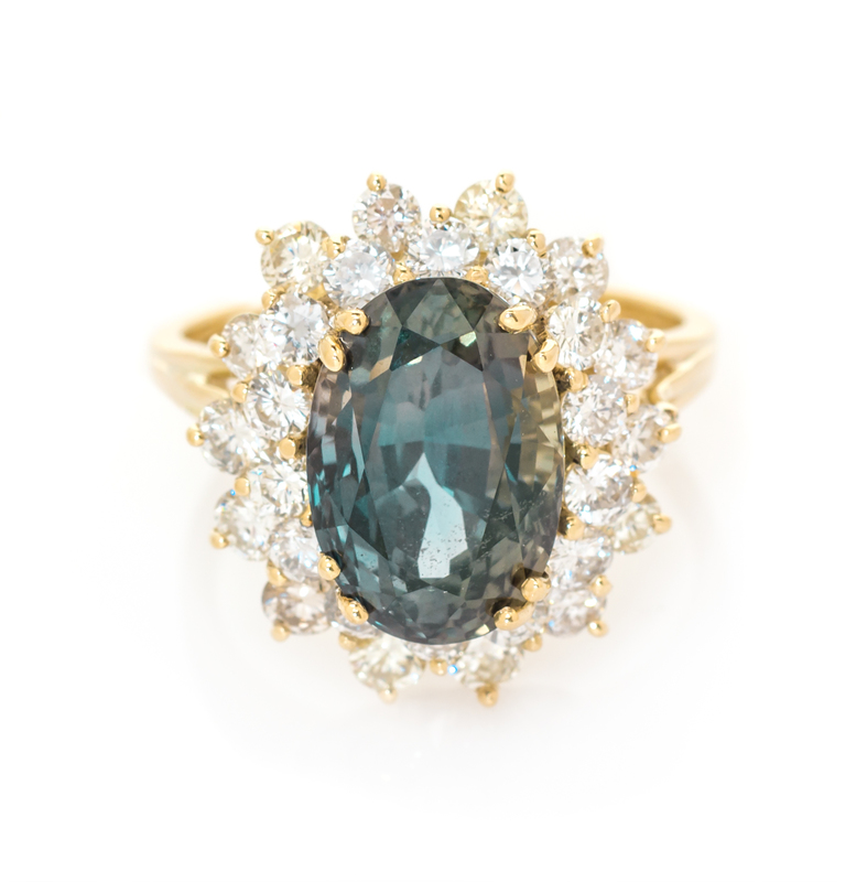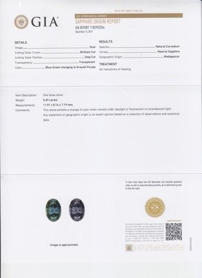 containing one oval mixed cut color change sapphire weighing 5.69 carats and 28 round brilliant cut diamonds weighing approximately 1.40 carats total.Stamp: 14K.Accompanied by a Gemological Institute of America sapphire identification and origin certificate number 1182932554, dated December 13, 2017, stating Species: Natural Corundum, Variety: Sapphire, stating Origin: Madagascar, Color: Blue-Green changing to Grayish Purple, Enhancement: No gemological evidence of heat.