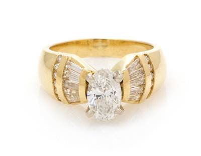 containing one oval brilliant cut diamond weighing approximately 1.19 carats, ten tapered baguette cut diamonds and 12 round brilliant cut diamonds weighing approximately 0.60 carat total.Stamp: 18K.