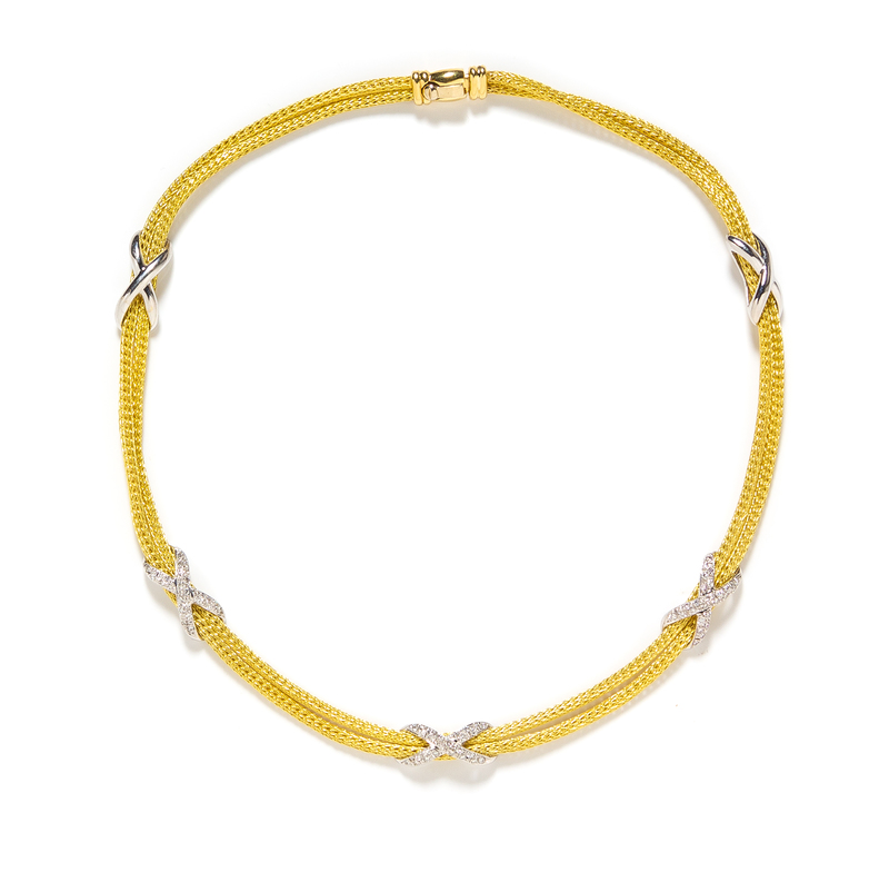 consisting of a double strand yellow gold woven mesh chain with five white gold cross stations containing 26 round brilliant cut diamonds weighing approximately 1.00 carat total.Stamp: 18KT ITALY GGR.
