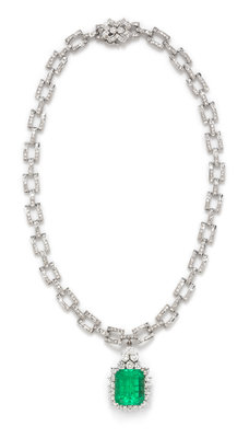 consisting of a pendant containing one octagonal step cut emerald measuring approximately 17.49 x 14.61 x 11.70 mm and 23 round brilliant cut diamonds weighing approximately 3.00 carats total, suspended from an open link chain containing 401 round single cut diamonds weighing approximately 1.60 carats total.Stamp: 18K BA.