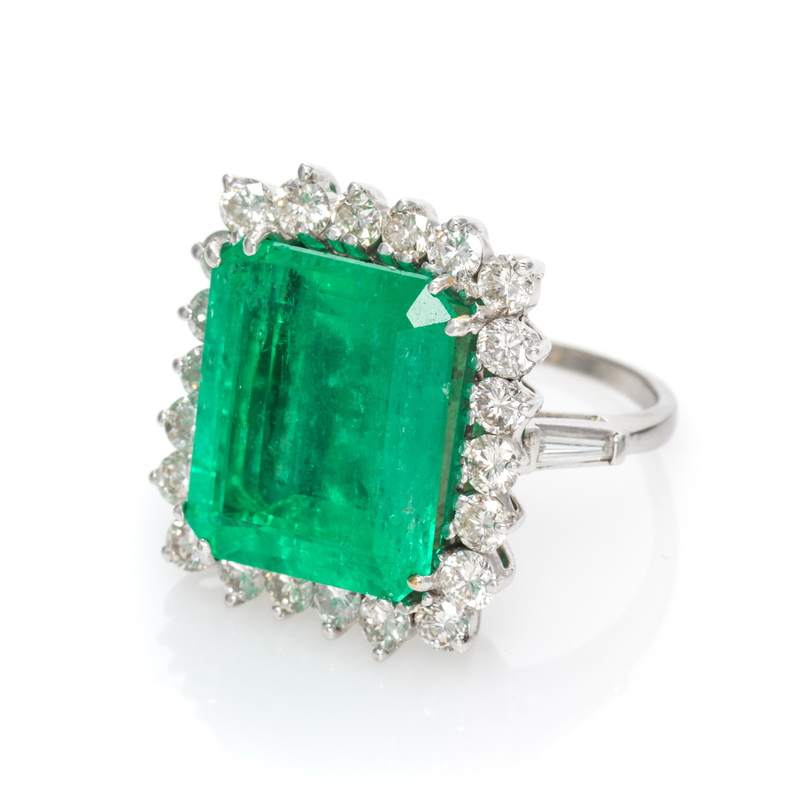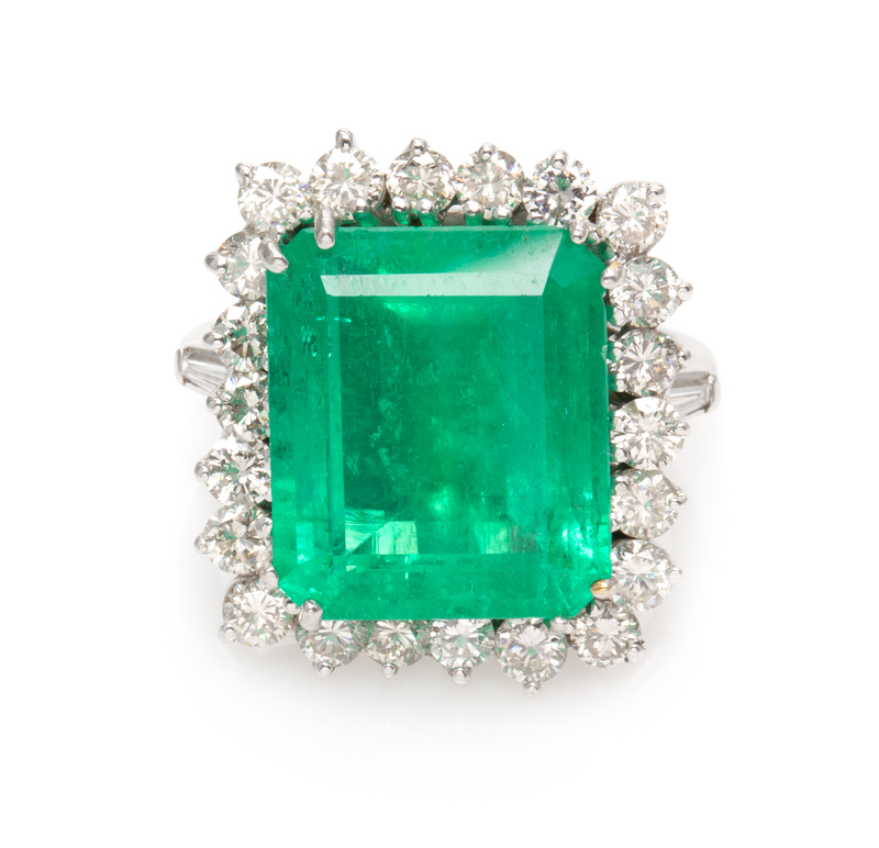 containing one octagonal step cut emerald measuring approximately 15.76 x 13.34 x 8.00 mm, 22 round brilliant cut diamonds weighing approximately 1.75 carats total, and two tapered baguette diamonds weighing approximately 0.08 carat total. Stamp: 10%IRIDPLAT.