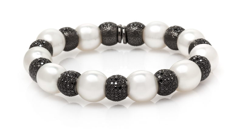 consisting of 11 black rhodium white gold beads pave set with 561 round brilliant cut black diamonds (origin of color not tested) weighing approximately 8.90 carats total alternating with 10 South Sea pearls measuring approximately 11.40-12.10 mm in diameter.Stamp: 18K (5212B scratchmark).