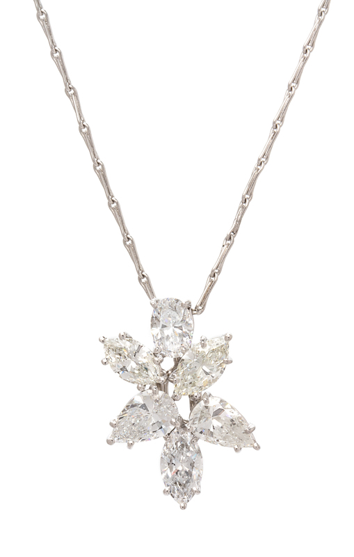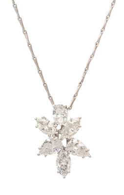 containing six marquise, oval, and pear shape brilliant cut diamonds weighing approximately 3.43 carats total, suspended from a platinum barleycorn chain.Stamp: PLATINUM.