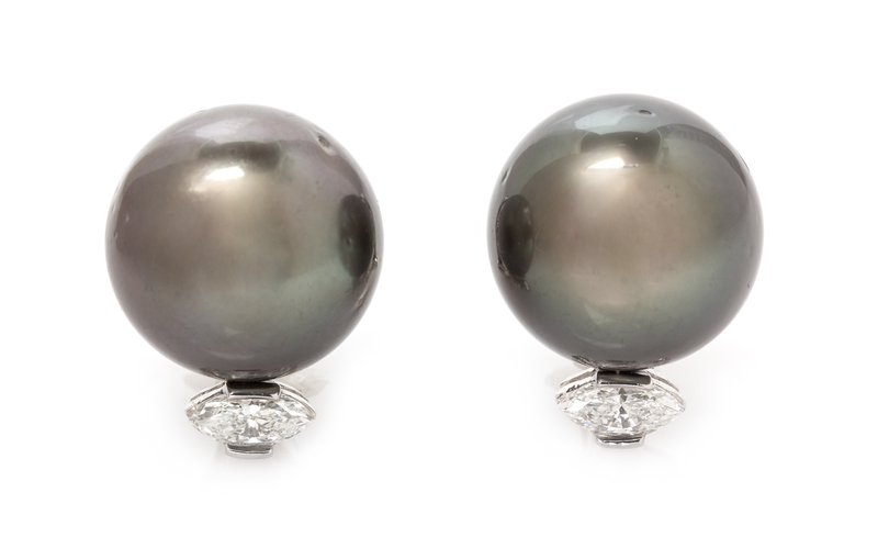 A Pair of Platinum, Cultured Tahitian Pearl and Diamond Earclips,