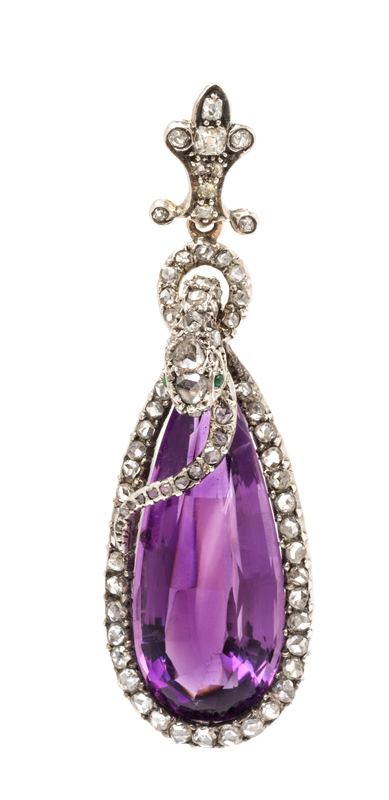 A Silver Topped Gold, Amethyst, Diamond and Emerald Serpent Motif Pendant,