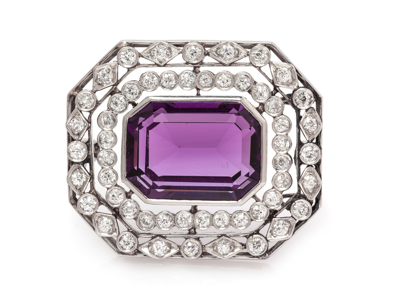 containing one octagonal step cut amethyst measuring approximately 16.35 x 12.35 x 8.60 mm and 52 old European cut diamonds weighing approximately 1.30 carats total, yellow gold pin back.