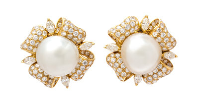 A Pair of 18 Karat Yellow Gold, Diamond and Cultured South Sea Pearl Earclips, Trio,