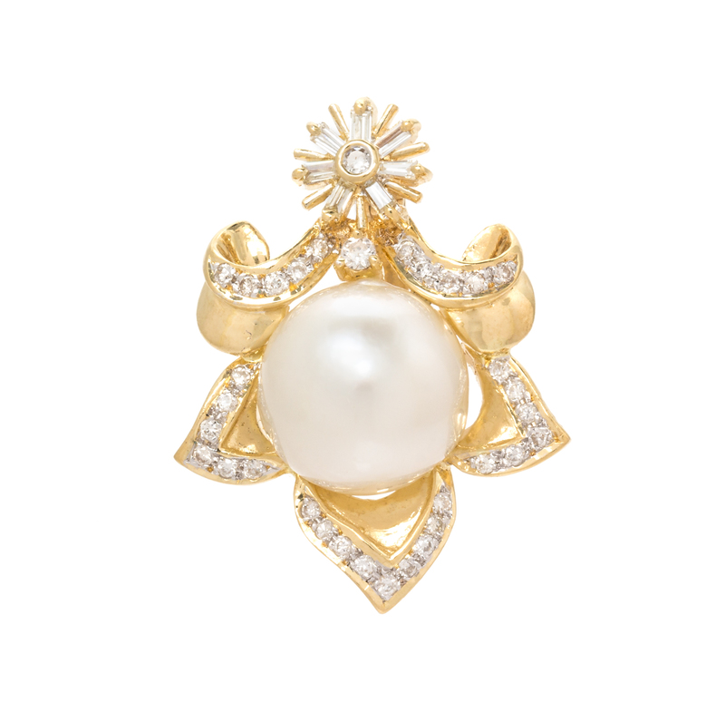 containing one South Sea pearl measuring approximately 12.62 mm in diameter, 33 round brilliant cut diamonds weighing approximately 0.30 carat total and seven baguette cut diamonds weighing approximately 0.25 carat total.Stamp: 18K 750.