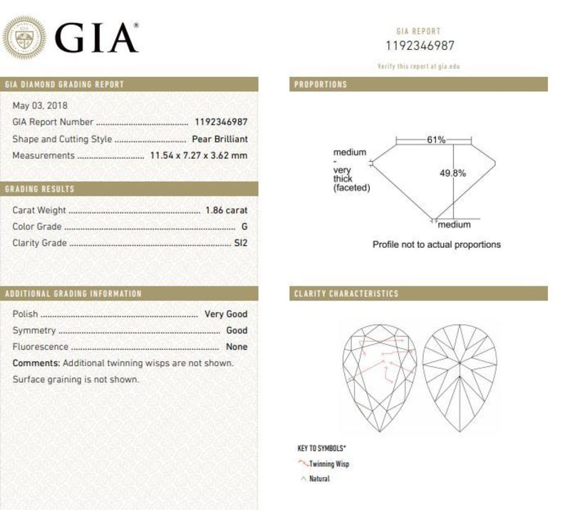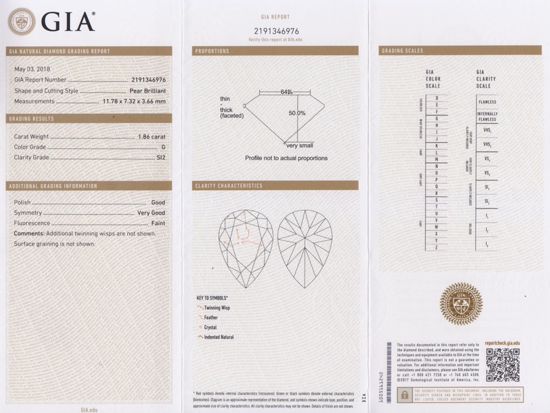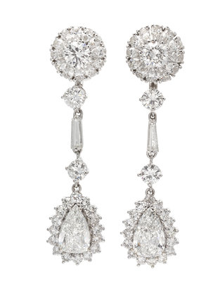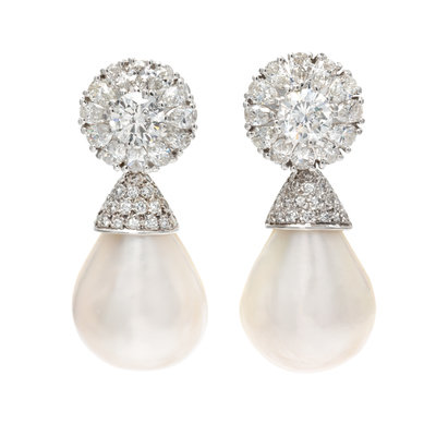 consisting of cluster setting tops containing two round brilliant cut diamonds weighing approximately 1.55 carats total and 14 pear shape brilliant cut diamonds weighing approximately 1.05 carats total, the detachable pendants contain two pear shape brilliant cut diamonds weighing 3.72 carats total, 36 round brilliant cut diamonds weighing approximately 3.42 carats total and two tapered baguette cut diamonds weighing approximately 0.45 carat total, together with a pair of interchangeable pendants containing two pear shape mother-of-pearl backed mabe pearls and 42 round brilliant cut diamonds weighing approximately 0.40 carat total.Accompanied by a Gemological Institute of America diamond grading certificate number 2191346976, dated May 3, 2018, stating Color: G, Clarity: SI2, Polish: Good, Symmetry: Very Good, Fluorescence: Faint.Accompanied by a Gemological Institute of America diamond grading certificate number 1192346987, dated May 3, 2018, stating Color: G, Clarity: SI2, Polish: Very Good, Symmetry: Good, Fluorescence: None.