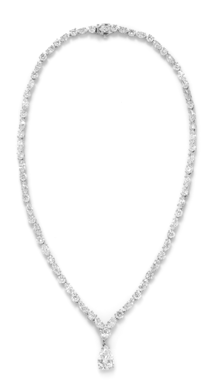 consisting of a necklace containing 35 round brilliant cut diamonds weighing approximately 9.57 carats total alternating with 35 marquise cut diamonds weighing approximately 12.53 carats total, suspending a detachable pendant containing one pear shape brilliant diamond weighing approximately 3.26 carats.Stamp: PT950Accompanied by a Gemological Institute of America diamond grading report number 10840339, dated September 21, 1999, stating Color: H, Clarity: VVS1, Polish: Good, Symmetry: Good, Fluorescence: Faint.