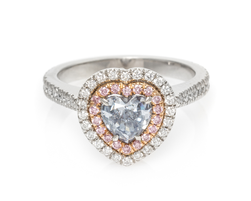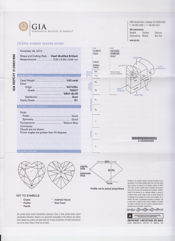 containing one heart shape brilliant cut fancy gray-blue diamond weighing 0.93 carat, 18 round brilliant cut pink colored diamonds (origin of color not tested) weighing approximately 0.07 carat total, and 52 round brilliant cut diamonds weighing approximately 0.18 carat total.Stamp: (maker's mark) PT900 750.Accompanied by a Gemological Institute of America colored diamond grading certificate number 2125831999, dated November 29, 2010, stating Color: Natural, Fancy Gray-Blue, Even, Clarity: SI1, Polish: Good, Symmetry: Good, Fluorescence: Medium Blue.