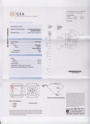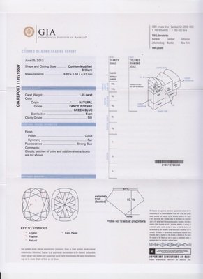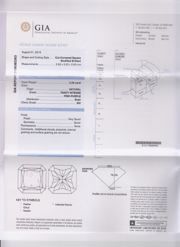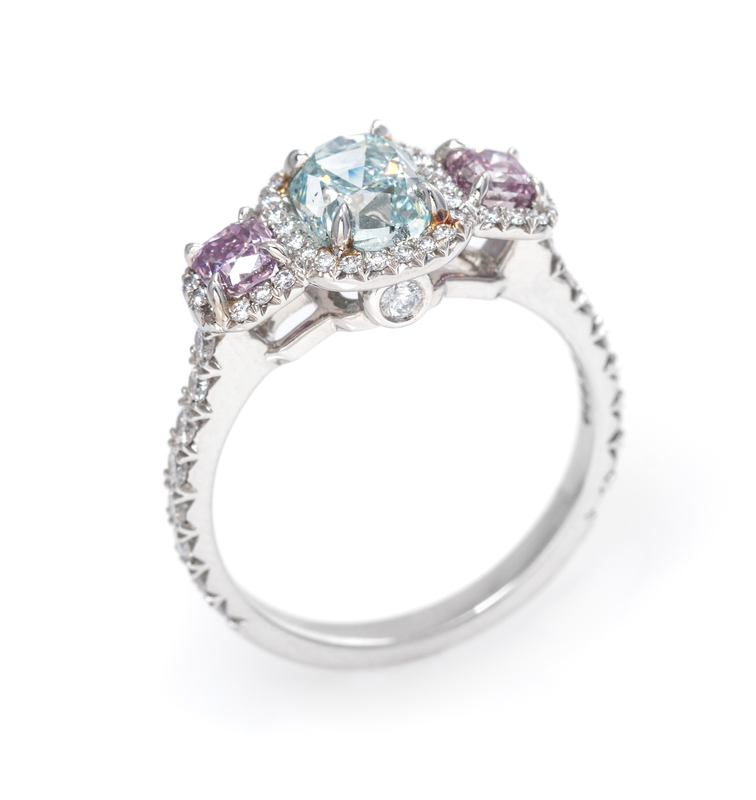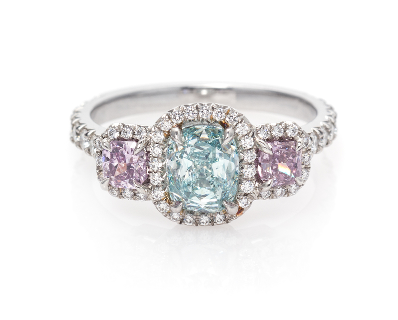 containing one rectangular cushion cut fancy intense green-blue diamond weighing 1.55 carats, one square radiant cut fancy intense pink-purple diamond weighing 0.28 carat, one square radiant cut fancy pink-purple diamond weighing 0.27 carat, and 57 round brilliant cut diamonds weighing approximately 0.40 carat total.Stamp: PT950. Accompanied by a Gemological Institute of America colored diamond grading certificate number 1139215537, dated June 05, 2012, stating Color: Natural, Fancy Intense Green-Blue, Even, Clarity: SI1, Polish: Good, Symmetry: Fair, Fluorescence: Strong Blue.Accompanied by a Gemological Institute of America colored diamond grading certificate number 5156382263, dated August 01, 2013, stating Color: Natural, Fancy Intense Pink-Purple, Even, Clarity: SI2, Polish: Very Good, Symmetry: Good, Fluorescence: None.Accompanied by a Gemological Institute of America colored diamond grading certificate number 5146365266, dated December 20, 2012, stating Color: Natural, Fancy Pink-Purple, Even, Clarity: SI2, Polish: Good, Symmetry: Good, Fluorescence: None.