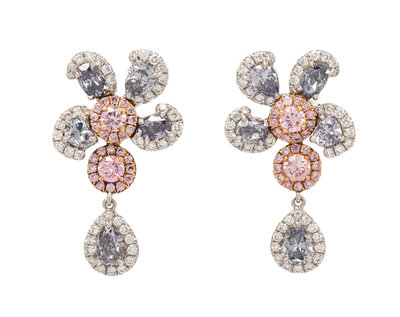A Pair of Platinum, Rose Gold, Fancy Gray-Blue Colored Diamond, Colored Diamond and Diamond Flower Motif Earrings,