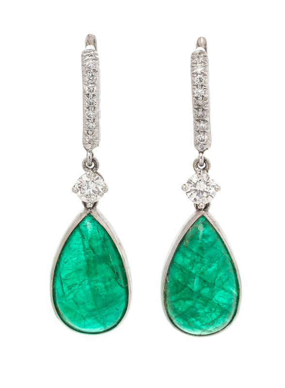 containing two pear shape cabochon emeralds weighing approximately 12.26 carats total and 18 round brilliant cut diamonds weighing approximately 0.58 carat total.Stamp: 750.