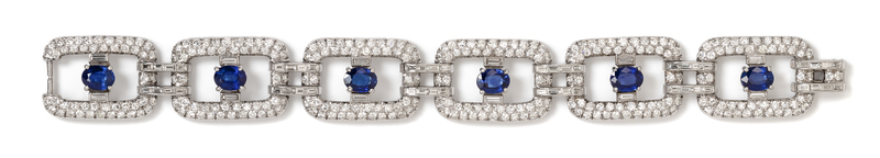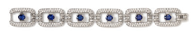 consisting of six open rectangular shaped links joined by a parallel double hinge design and hidden clasp, containing six oval mixed cut sapphires weighing approximately 9.26 carats total, 60 baguette cut diamonds weighing approximately 3.65 carats total, and 302 round brilliant cut diamonds weighing approximately 12.05 carats total, measuring approximately 20.00 mm wide