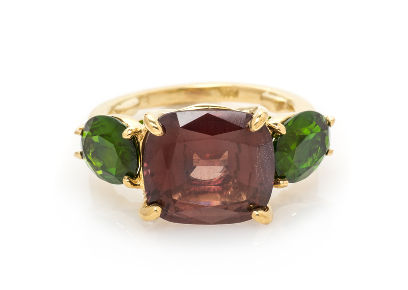 An 18 Karat Yellow Gold, Pinkish Brown Sapphire and Chrome Diopside Ring,