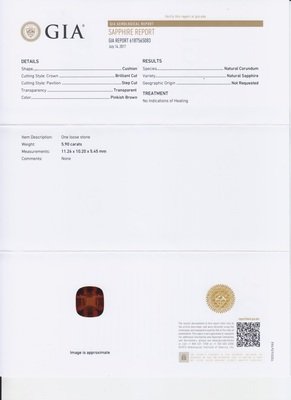 containing one cushion shape mixed cut pinkish brown sapphire weighing 5.90 carats and two oval mixed cut chrome diopside measuring approximately 7.96 x 6.01 mm.Stamp: 18K.Accompanied by a Gemological Institute of America sapphire report number 6187565083, dated July 14, 2017, stating Species: Natural Corundum, Variety: Sapphire, Color: Pinkish Brown, Enhancement: No indications of heat,