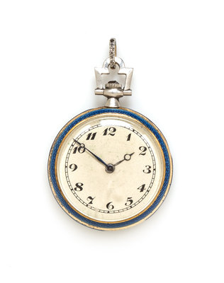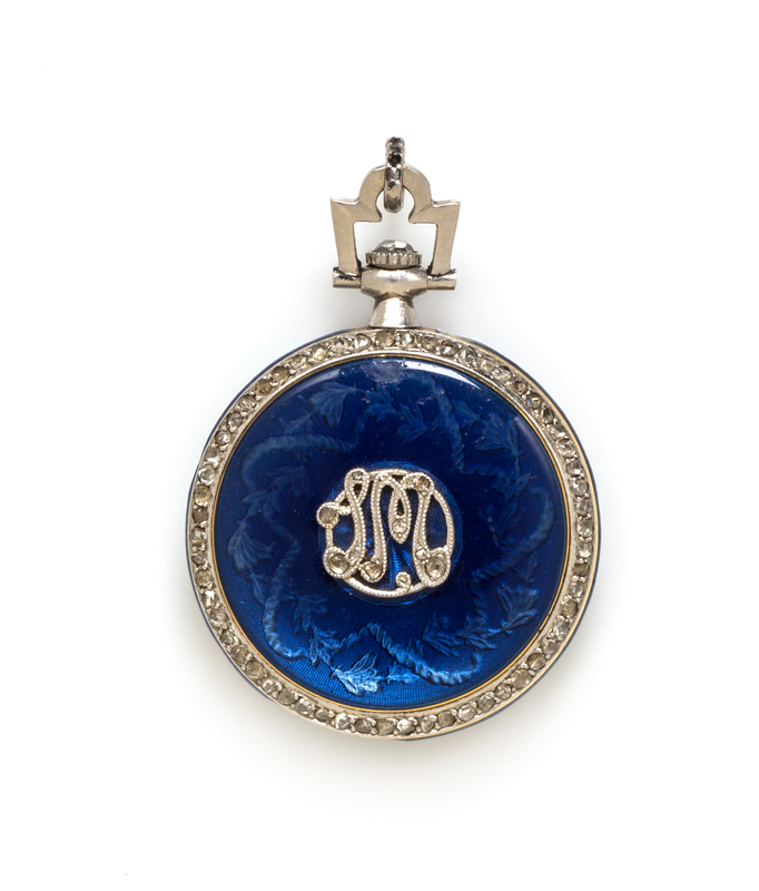 22.00 mm case diameter, matte silvered dial, Arabic numerals, blued steel moon hands, translucent blue enamel bezel, the reverse consisting of an openwork "LM" monogrammed platinum plaque containing nine rose cut diamonds surmounted over translucent blue enamel and guilloche background with rose cut diamond bezel, platinum bow and crown set with one rose cut diamond, stem wound and set gilt jeweled movement with blued screws.Stamp: (French hallmark) 32606 (SG maker's mark).