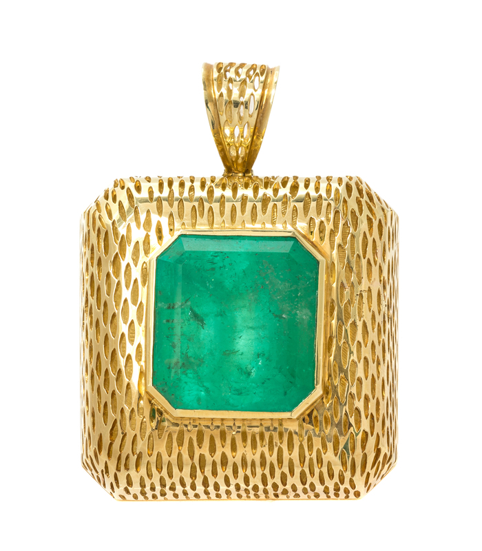 containing one octagonal step cut emerald measuring approximately 26.00 x 24.00 mm surmounted within a pierced setting measuring approximately 46.00 x 63.00 mm.