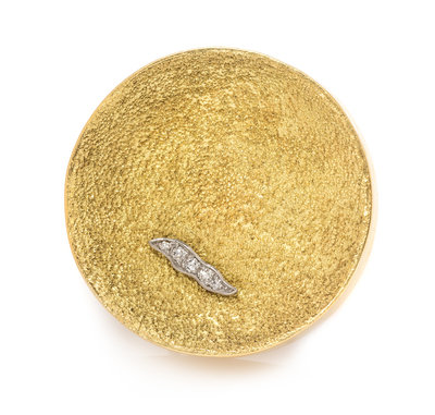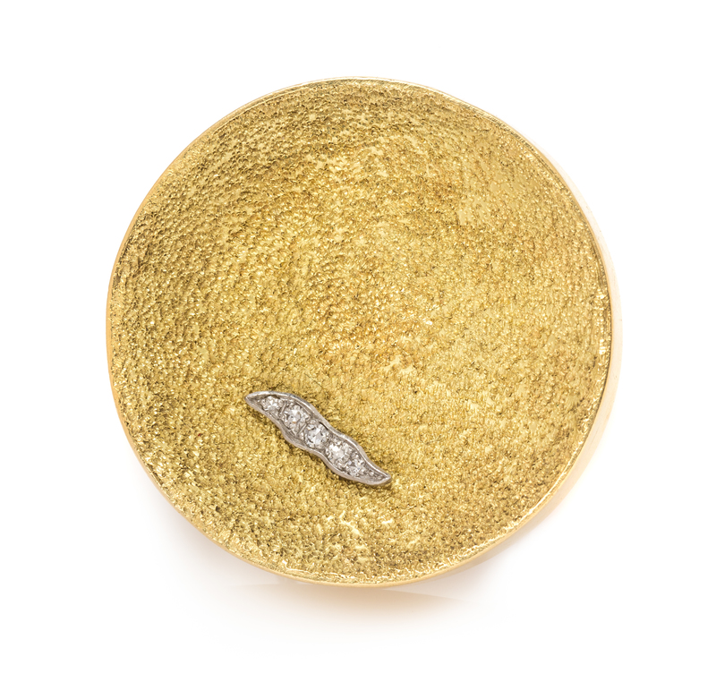 consisting of a circular concave disc with brush finish surmounted with a platinum plaque containing five round single cut diamonds, measuring approximately 35.00 mm in diameter.Stamp: GRIMA 0.750 AG. (British hallmarks).
