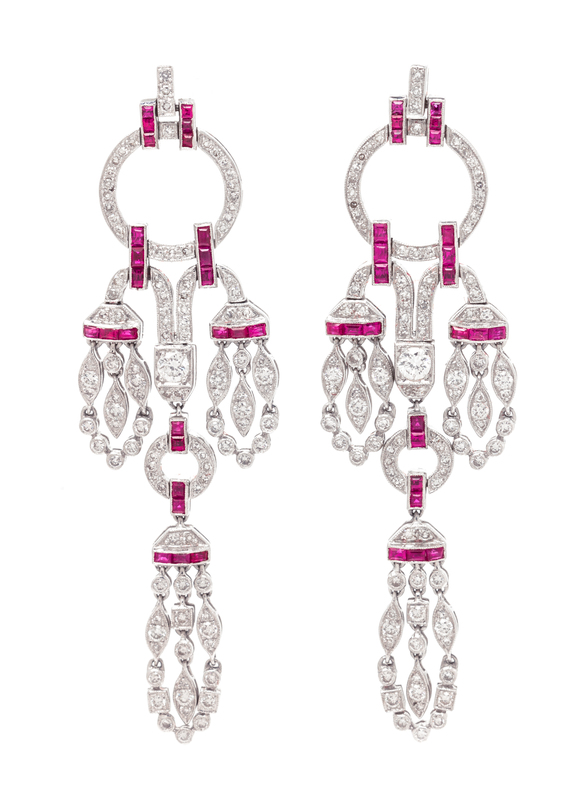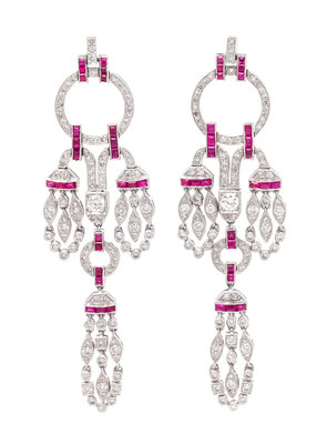 A Pair of 18 Karat White Gold, Diamond and Ruby Chandelier Earrings,