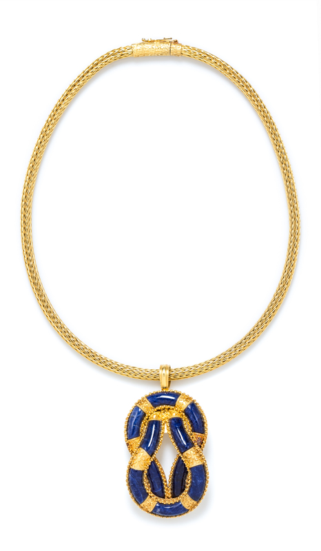An 18 Karat Yellow Gold and Sodalite 'Hercules Knot' Pendant and Chain, Ilias Lalaounis, Circa 1970's,