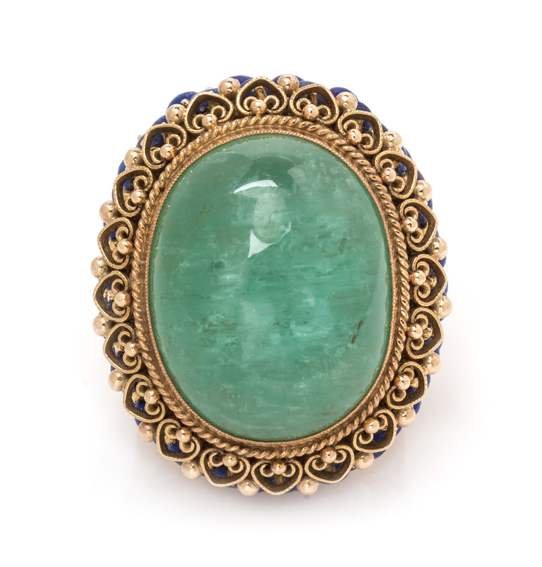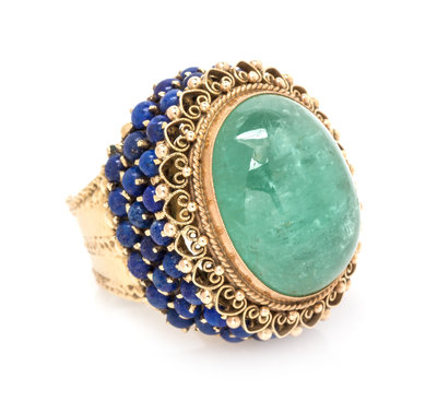 A 14 Karat Yellow Gold, Green Beryl and Lapis Lazuli Ring,