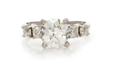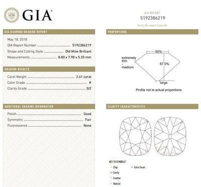 containing one old mine brilliant cut diamond weighing 2.41 carats and four old mine cut diamonds weighing approximately 0.70 carat total.Stamp: 100IRID-900 10%IRID-PLAT.Accompanied by a Gemological Institute of America diamond grading certificate number 5192386219, dated May 18, 2018, stating Color: K, Clarity: SI2, Polish: Good, Symmetry: Fair, Fluorescence: None.