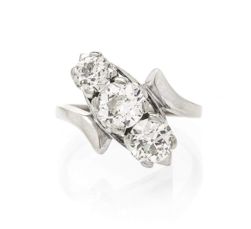 containing one old European cut diamond weighing approximately 0.90 carat, one old European cut diamond weighing approximately 0.80 carat and one old European cut diamond weighing approximately 0.54 carat.