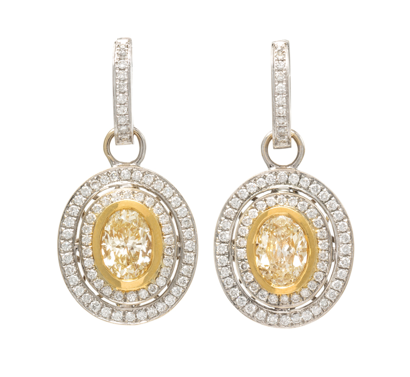 consisting of two hoop earrings with detachable oval openwork pendants containing two oval brilliant cut colored diamonds (origin of color not tested) weighing approximately 3.18 carats total and 144 round brilliant cut diamonds weighing approximately 0.90 carat total.Stamp: 18K 750.