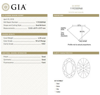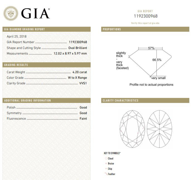 measuring approximately 12.02 x 8.97 x 5.97 mm.Accompanied by a Gemological Institute of America diamond grading certificate number 1192300968, dated April 25, 2018, stating Color: W-X, Clarity: VVS1, Polish: Good, Symmetry: Good, Fluorescence: Faint.
