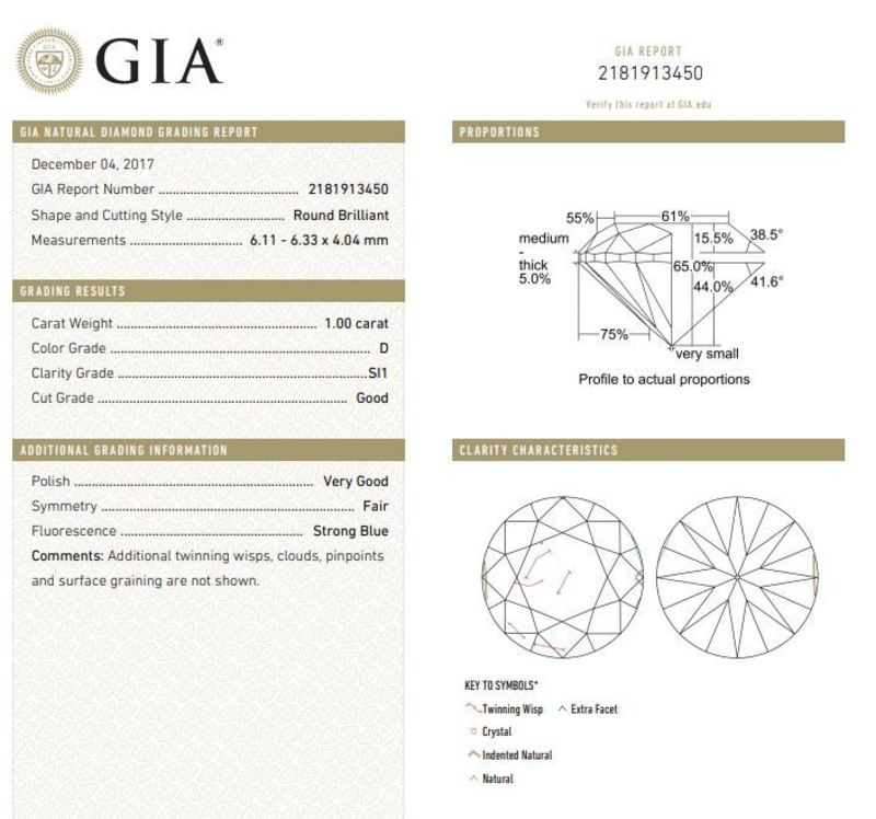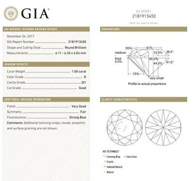measuring approximately 6.11-6.33 x 4.04 mm.Accompanied by a Gemological Institute of America diamond grading certificate number 2181913450, dated December 4, 2017, stating Color: D, Clarity: SI1, Cut: Good, Polish: Very Good, Symmetry: Fair, Fluorescence: Strong Blue.