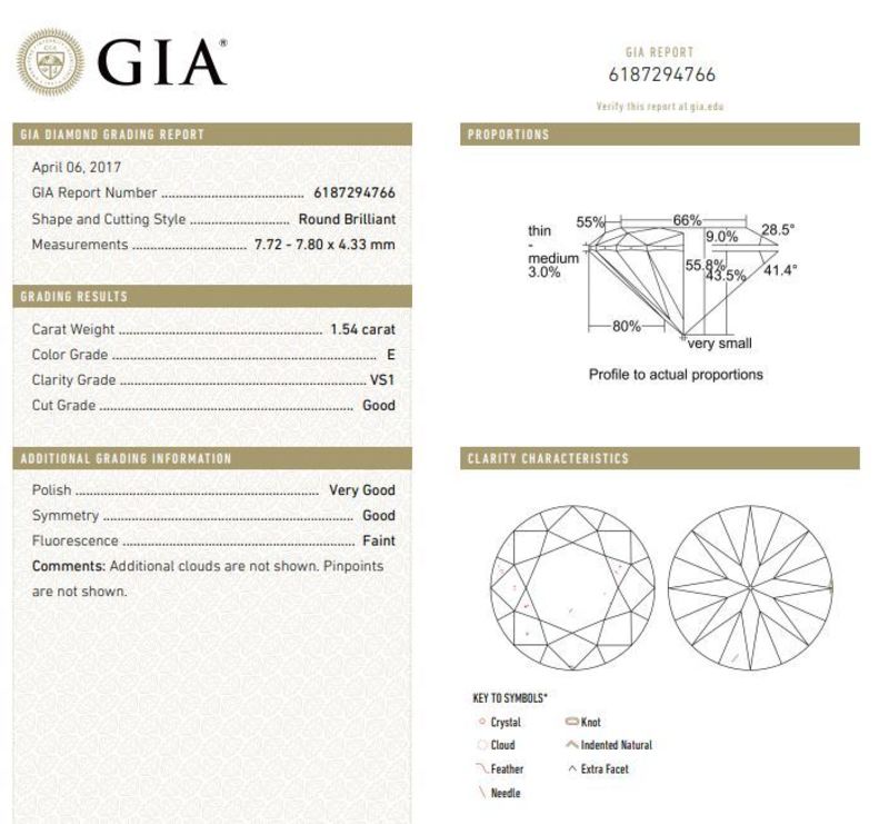 measuring approximately 7.72-7.80 x 4.33 mm.Accompanied by a Gemological Institute of America diamond grading certificate number 6187294766, dated April 6, 2017, stating Color: E, Clarity: VS1, Polish: Very Good, Symmetry: Good, Fluorescence: Faint.