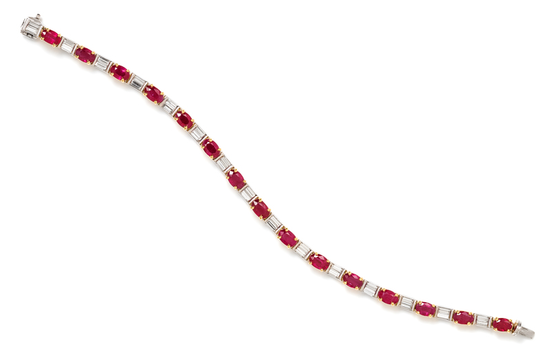 containing 15 oval mixed cut rubies weighing approximately 9.05 carats total and 30 baguette cut diamonds weighing approximately 3.70 carats total.Stamp: PT950 18K.