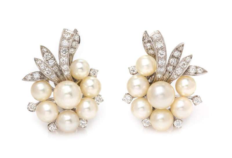 A Pair of White Gold, Diamond and Cultured Pearl Earclips,